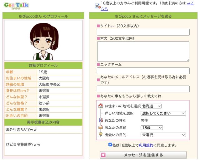 女性のアイコンをクリックすると、「Gee Talk」という高額課金の出会い系のページに飛びました。あなたがこの出会い系に登録すると、掲示板の運営者は1,000円〜2,000円程度の報酬を得ます。