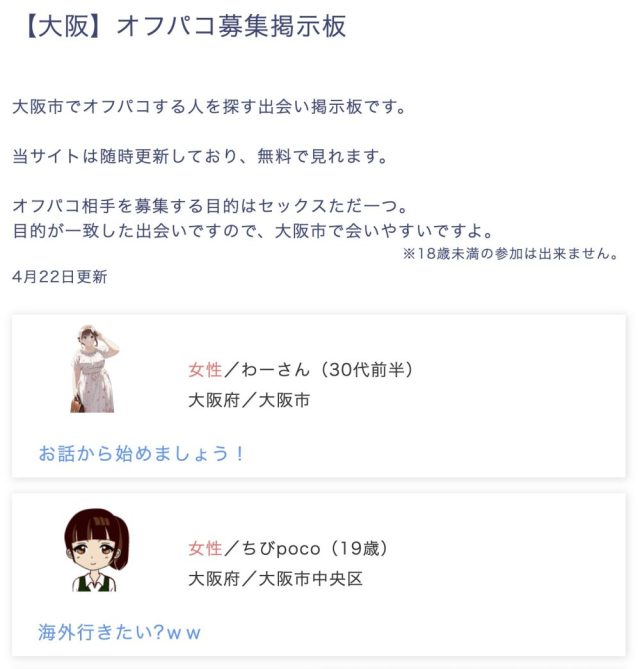 「大阪 オフパコ」でGoogle検索をすると、オフパコの掲示板がいくつか表示されます。残念ですが、どの掲示板も絶対に出会えません。