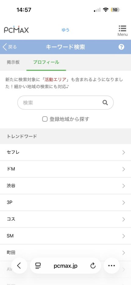 次はキーワード検索機能です。「梅田」「難波」「天王寺」のように検索すれば、その地域に住む女性を探せます。