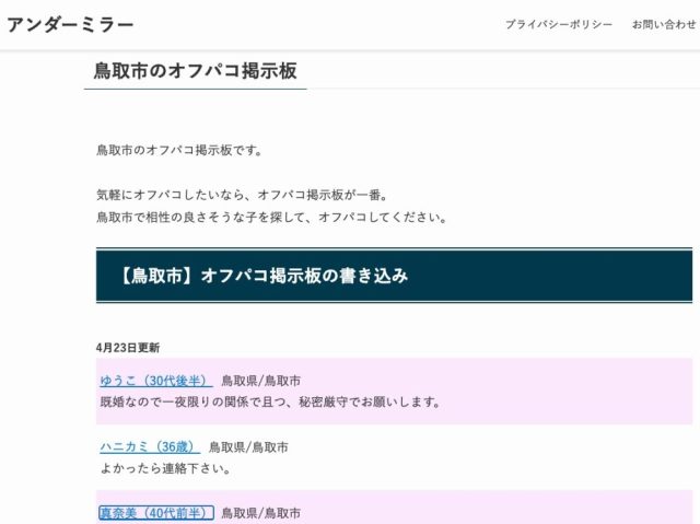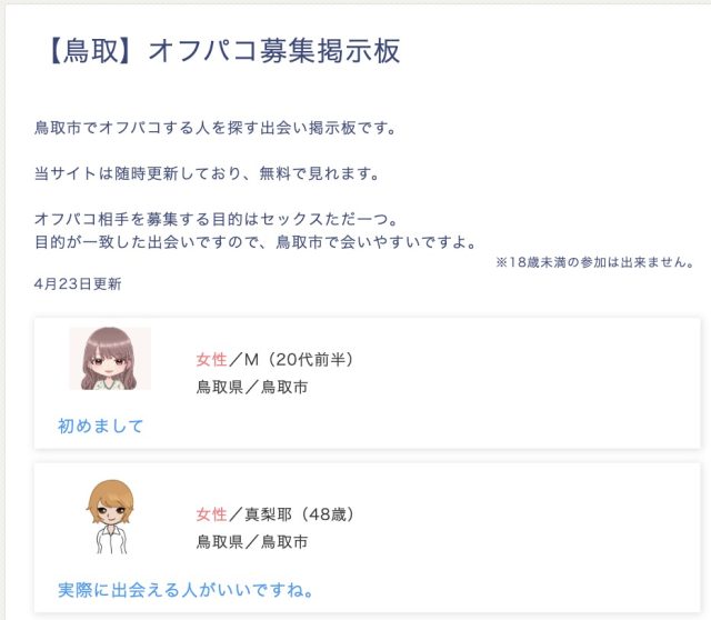「鳥取 オフパコ」でGoogle検索をすると、オフパコの掲示板がいくつか表示されます。残念ですが、どの掲示板も出会えません。