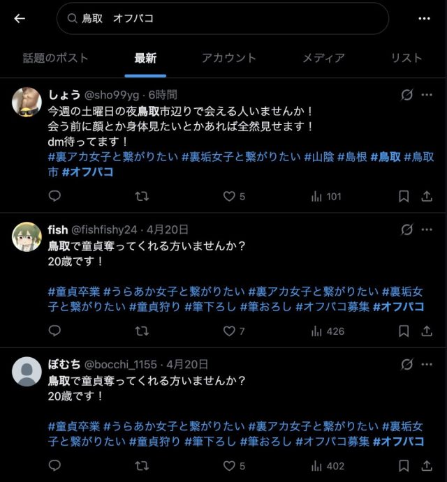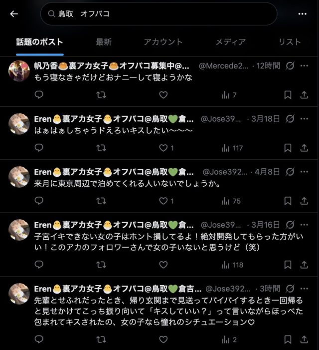 Xで「鳥取 オフパコ」で検索するとこんなエロツイートが表示されます。こういったエロツイートをするのはネカマか詐欺業者のどちらかです。