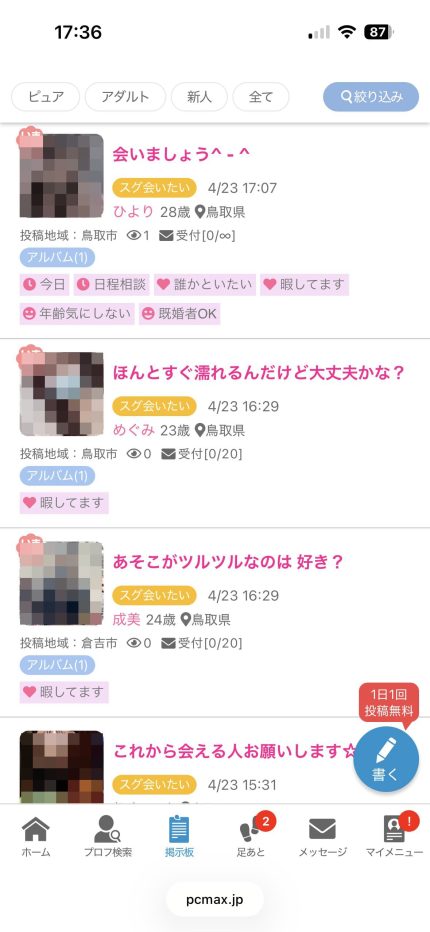 「掲示板検索」の中に「詳細地域設定」という機能があります。近くにいる女性の募集を見つけやすいです。